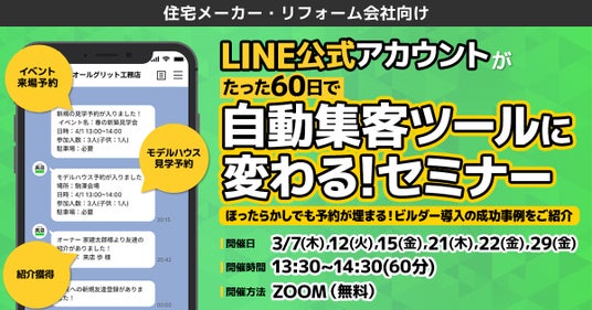 本セミナーでは、本セミナーでは、住宅メーカー・リフォーム会社がLINE公式アカウントを集客に活用するための打ち手をまとめてご紹介します。「集客に苦戦している」「なかなか来場まで引き上がらない」といったお悩みを抱える会社様に向けて、提携先企業様の成功事例を交えながら、LINE公式アカウントを使った集客戦略をお話する無料セミナーです。