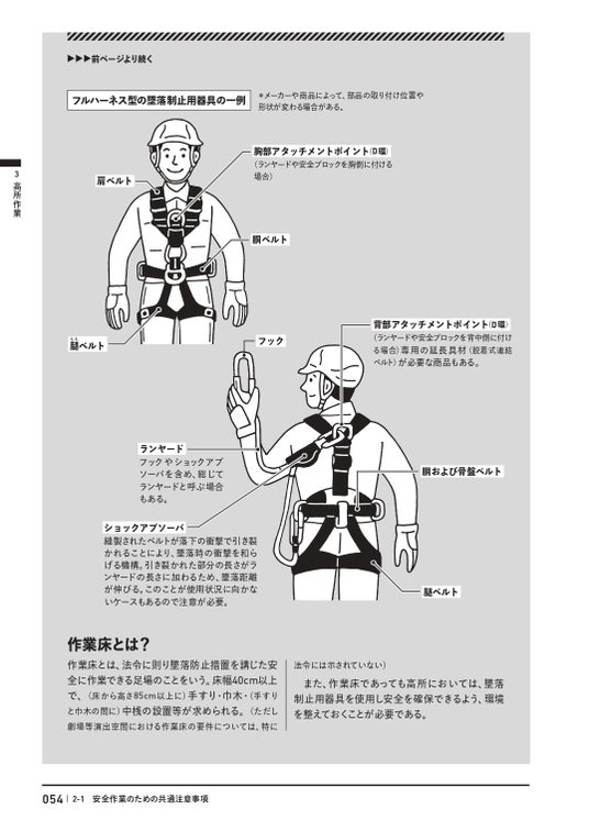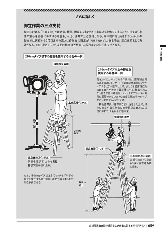 特に危険度の高い高所作業については、着用が義務付けられるようになったフルハーネス型の墜落制止用器具や、脚立の使用法など、イラストを用いて説明。また、公演中のアクシデントや地震などの自然災害・火災・感染症拡大などの緊急時に、公演の再開/中止を判断するにはどのような手順と備えが必要か、なども表やチャートにまとめました。