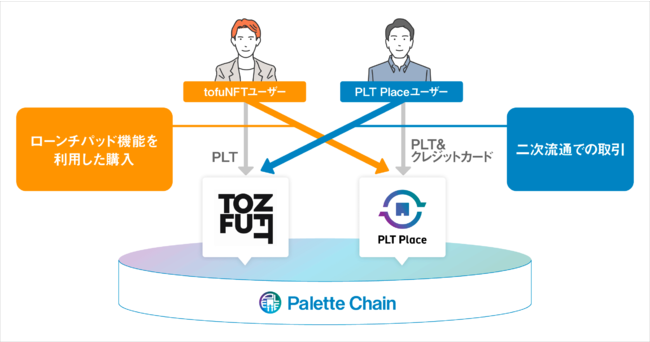 今回の提携によりHashPaletteが開発を手掛けるNFTに特化したブロックチェーン「パレットチェーン(Palette Chain)」がtofuNFTに新規チェーンとして追加されます。同じくHashPaletteが運営する公式NFTマーケットプレイスPLT Placeと連携を行い、二次流通の場としてtofuNFTをユーザー様は選択することが可能となります。