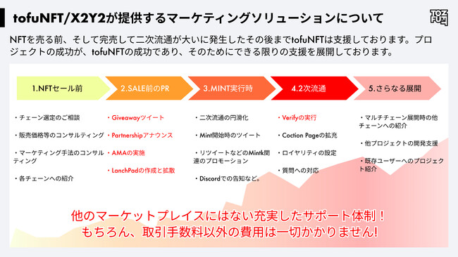tofuNFTでは手厚いサポートを行っており、そこに対して取引手数料以外いただいておりません。日本の事業者様でNFTプロジェクトを検討されている事業者様は、是非とも一度ご相談ください。連絡先は、contact@tofunft.com宛もしくは日本語コーポレートサイトにお問合せ(https://service.tofunft.com/)にお願いいたします。