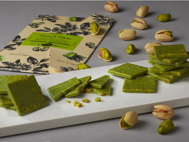 塩味のきいたピスタチオチョコレートに刻みピスタチオを練り込み、パリッと薄いタブレットにしました。
