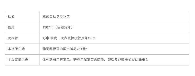 タウンズは、「診断技術で、安心な毎日を。」とのコーポレート・スローガンのもと、新型コロナウイルスやインフルエンザウイルスをはじめとする感染症の抗原検査キットの医療機関等への供給を通じて、疾病の診断、早期発見のお手伝いをし、人々の生活に安心と潤いを届けることを経営理念としています。