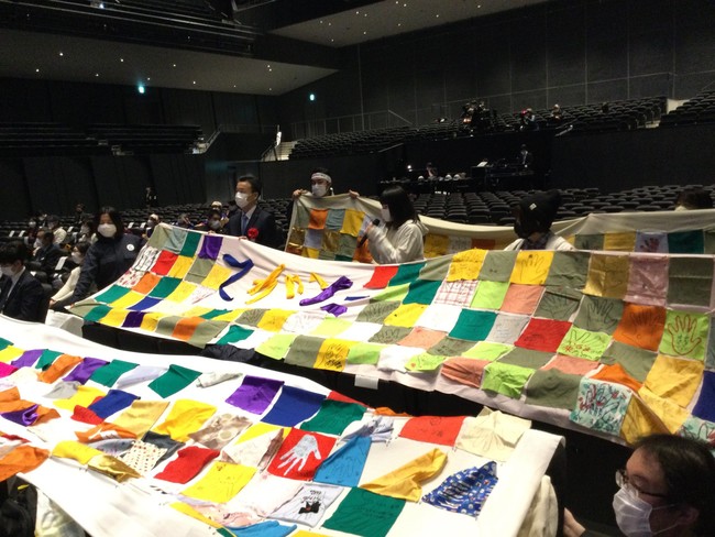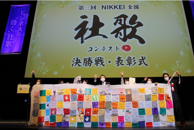決勝戦では、たくさんの方からいただいた、想いの込められた「応援てがた」で作った応援幕を携えて、アピールしました。結果、142の社歌の中から第3位と主催者特別賞を受賞しました。