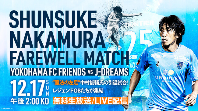 本試合は、昨年現役を退いた中村俊輔氏の引退記念試合で、中村氏にゆかりのあるレジェンドOBたちが集結し、「横浜FC FRIENDS vs J-DREAMS」としてニッパツ三ツ沢球技場にて対戦します。