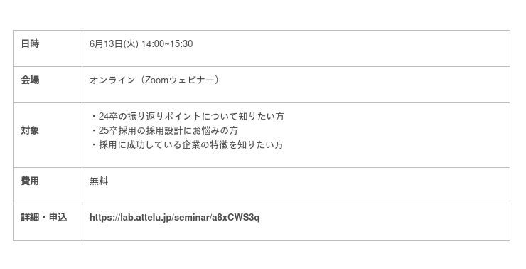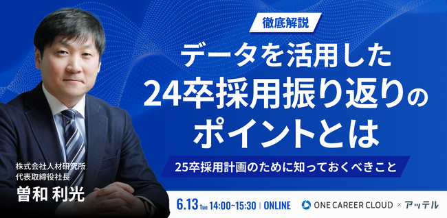 締役:塚本 鋭)は、新卒採用人事向けの無料オンラインセミナー「【徹底解説】データを活用した24卒採用振り返りのポイントとは」を2023年6月13日(火)1に開催いたします。
