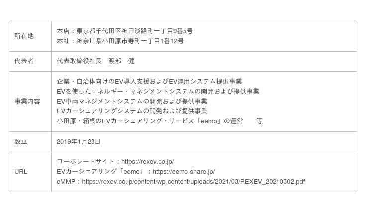 Energy Techの株式会社REXEV(本社:東京都千代田区、代表取締役社長:渡部 健)は、中国電力株式会社(本社:広島県広島市、代表取締役社長:清水 希茂)、株式会社エネルギアL&Bパートナーズ(本社:広島県広島市、取締役社長:松村 秀雄)、住友三井オートサービス株式会社(本社:東京都新宿区、代表取締役社長:露口 章)およびSMAサポート株式会社(本社:東京都新宿区、取締役社長:露口章)と、EVソリューションサービス「eeV」の提供に向けた業務提携契約を締結することに合意しましたのでお知らせします。