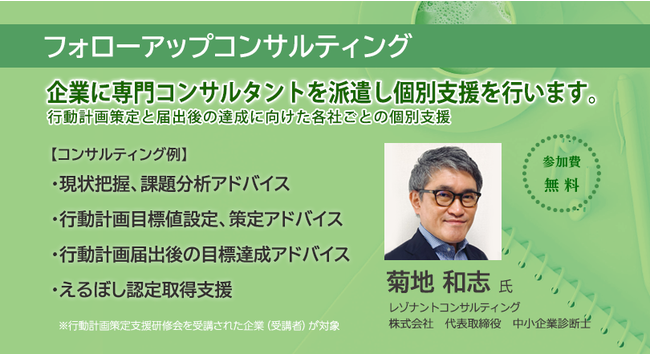 また、研修会に参加いただいた企業様には、無料で専門家を派遣する「フォローアップコンサルティング」も実施しております。コンサルティングは1社2回まで。予定数に達し次第受付を終了させていただきますので、お早めにお申し込みください。 ※コンサルティングをご希望の場合は、「行動計画策定支援研修会」のお申し込み時にお知らせください。
