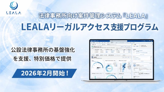 株式会社レアラ(本社:東京都中央区、代表取締役:林 和成)は、当社パーパス「法とテクノロジーの力で、未来を諦めなくてすむ社会を創る」のもと、公設法律事務所およびひまわり基金法律事務所を対象に、法律事務所向け案件管理システム『LEALA(レアラ)』を公設法律事務所向け価格で提供する「LEALAリーガルアクセス支援プログラム」を2026年2月より開始します。
