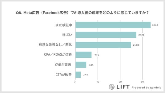- Meta広告でもAI導入の成果を「まだ検証中」が33.6%で最多の結果に。「横ばい」は27.2%、「改善なし/悪化」は24.8%と、約半数が期待した成果を得られていない。