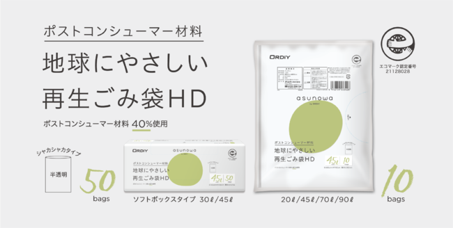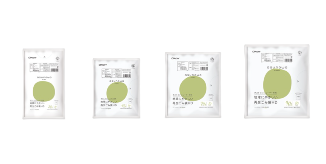 オルディ株式会社(代表取締役社長 寳田昌也)は、持続可能な社会の実現を目指して、地球にやさしい再生(ポストコンシューマ―)材料を使用した「asunowa(あすのわ)再生ごみ袋HD」を4月15日より発売いたします。