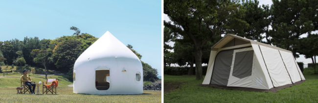 アウトドアリビングの設置と、Instant House by LIFULや、薪ストーブや焚火を楽しむテント等の異なる3タイプのテントなどでの寝床の提供。