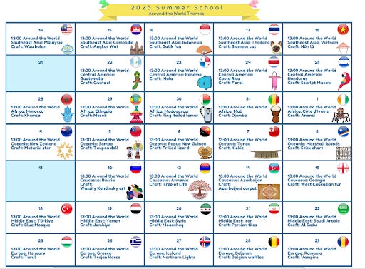 幼児から小学生までの子どもに質の高いお預かりと教育サービスを提供する株式会社ウィズダムアカデミー(本社:東京都豊島区、代表取締役:鈴木良和、以下、ウィズダムアカデミー)は、2025年7月14日(月)~8月29日(金)に「SUMMER SCHOOL(サマースクール) 2025」を開催いたします。インターナショナルな学びと異文化体験を融合させた、まるでホームステイのような夏休みプログラム「English Explorers: Summer Ventures 2025」。プログラムは全7週間、週ごとに異なる地域(アジア、中米、アフリカ、オセアニア、コーカサス、中東、ヨーロッパ)をテーマにした「バーチャル世界旅行」として構成され、子どもたちは“英語で世界を体験”します。