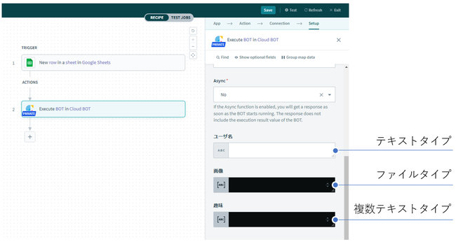 BOTの連携設定を行う際に使用するアクションのインターフェースを改善しました。クラウドBOT上のデータタイプである、「テキストタイプ」、「ファイルタイプ」、「複数テキストタイプ」を自動判別し、それぞれに適した入力フォームを提供します。