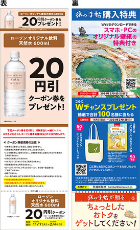 旅の手帖MOOK『秘湯 野湯 濃い温泉100』または『日本の絶景100』をローソンで購入すると、「ローソン オリジナル飲料 天然水600㎖」の割引クーポン20円が付いてくるほか、MOOKオリジナル壁紙(スマホ・PC)を無料でダウンロードできます。