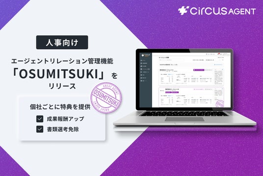 circus株式会社(本社:東京都中央区、代表取締役:矢部 貴志)は、人材紹介プラットフォーム「circusAGENT」を利用する採用企業向けに、エージェントリレーション管理機能「OSUMITSUKI(オスミツキ)」をリリースいたしました。