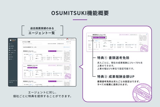 「OSUMITSUKI」は、過去に1人以上推薦実績があるエージェントに対し、個別に特典を提供することができる企業人事向けのcircusAGENT内の新しい機能です。