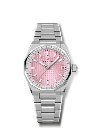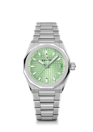 ミッドサイズのデファイ スカイラインは、文字盤を3つのカラーからお選びいただけます。「デファイ」ラインは1969年以来、常に色彩の美学を探究しています。今回の新作には、41mmと同じメタリックディープブルーに加え、「デファイ」では初となるピンクとグリーンのパステルトーンが採用されました。メタリックのベースにポリッシュ仕上げとサテンブラッシュド仕上げを施し、文字盤の上部に配されたゼニススターが放つ輝きを再現しています。幾何学的なパターンを構成する4つの点を結んだ星の刻印は、1960年代のゼニスの「ダブルZ」ロゴを現代的に解釈したものです。立体感と傾斜のあるチャプターリングはベゼルと同じ12角形をなし、建築的な深みを与えています。日付表示は文字盤と完全に調和するよう、同じカラーに仕上げられています。