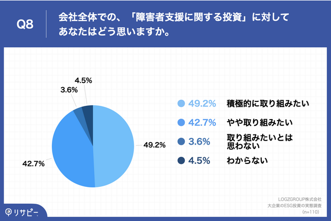 「Q8.会社全体での、「障害者支援に関する投資」に対してあなたはどう思いますか。」(n=110)と質問したところ、「積極的に取り組みたい」が49.2%、「やや取り組みたい」が42.7%という回答となりました。