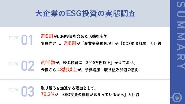 上場企業の約9割がESG投資を含めた活動を実施しており、具体的な取り組み内容として、「産業廃棄物処理」や「CO2排出削減」が約6割を占めていることが分かりました。また、約半数がESG投資に「3000万円以上」かけており、ESG投資の機運が高まっていることから、今後さらに予算増加・取り組み加速の意向を示しました。
