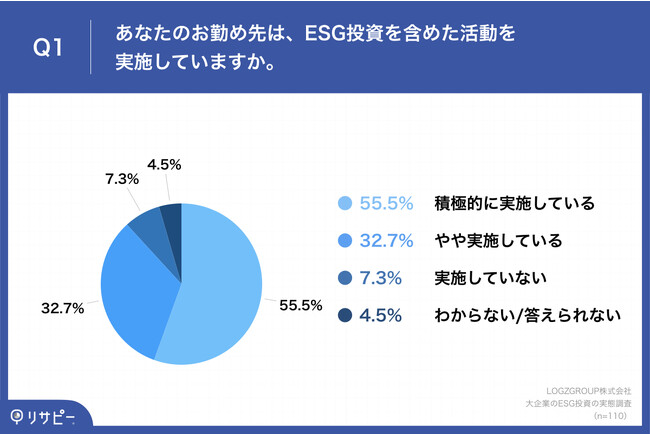 「Q1.あなたのお勤め先は、ESG投資を含めた活動を実施していますか。」(n=110)と質問したところ、「積極的に実施している」が55.5%、「やや実施している」が32.7%という回答となりました。