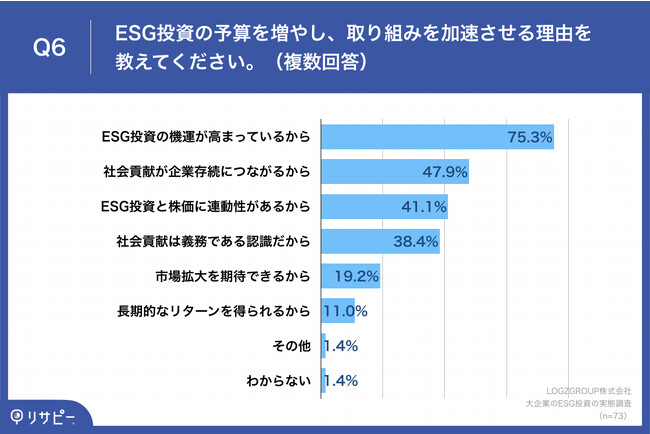 Q5で「非常にそう思う」「ややそう思う」と回答した方に、「Q6.ESG投資の予算を増やし、取り組みを加速させる理由を教えてください。(複数回答)」(n=73)と質問したところ、「ESG投資の機運が高まっているから」が75.3%、「社会貢献が企業存続につながるから」が47.9%、「ESG投資と株価に連動性があるから」が41.1%という回答となりました。
