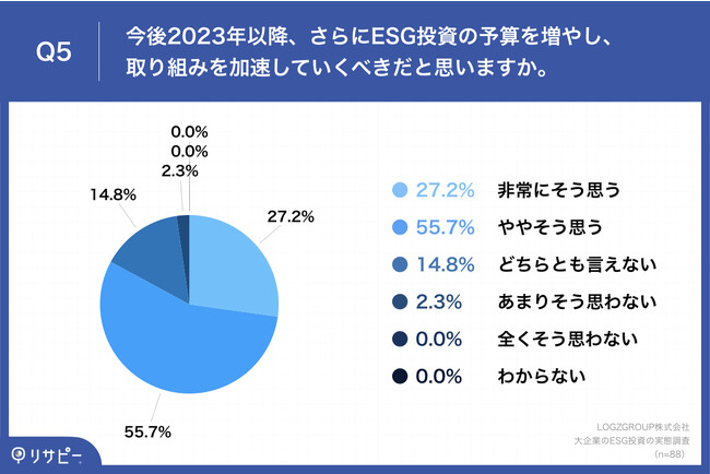 「Q5.今後2023年以降、さらにESG投資の予算を増やし、取り組みを加速していくべきだと思いますか。」(n=88)と質問したところ、「非常にそう思う」が27.2%、「ややそう思う」が55.7%という回答となりました。