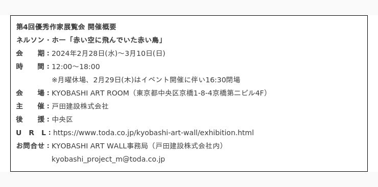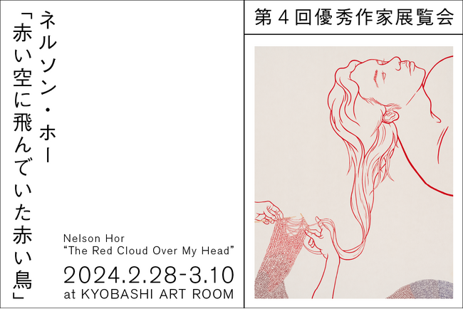戸田建設株式会社(社長:大谷清介)が、新進アーティストを支援する目的で始めた現代アート作品公募プロジェクト「KYOBASHI ART WALL ―ここから未来をはじめよう」の第4回優秀作家に選出したネルソン・ホーの展覧会「赤い空に飛んでいた赤い鳥」を2024年2月28日~3月10日に開催いたします。日本画の手法を用いて赤い岩絵具で描くネルソンの作品はメンタルヘルスやLGBTQに対する差別などの社会問題をテーマにしています。本展ではTODA BUILDING(以下、TODAビル)建設中仮囲に掲出している《編むこと、思い出すこと》の実作品に加え、不吉なことを想起する赤い鳥が舞う空が広がるインスタレーションを展覧いたします。TODAビル開業前最後の展覧会をご高覧ください。
