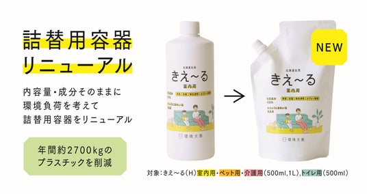 環境大善株式会社(本社・北海道北見市)は天然成分100%の消臭液「きえ~る」シリーズ詰替用について、一部の容器をボトルタイプからパウチタイプへと変更いたします。容器を変更することでプラスチック量を最大71%削減して、環境に配慮したモノづくりを推進いたします。