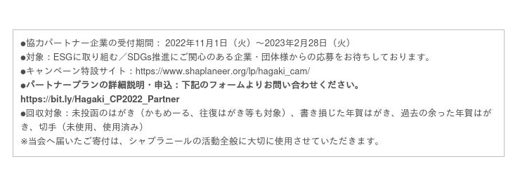 教育支援等の強化に向けた不要なはがき&切手の回収・送付や、キャンペーンへの協賛等で協力するパートナー企業・団体を全国から募集します。ご登録後はシャプラニールのHP・公式SNS・PR発信など各種広報活動の中で社名やロゴ等のご掲載・ご紹介させていただきます。詳細は下記よりお問合せください。NGOや企業などさまざまな組織の枠組みを超えた取り組みとして、「日産自動車株式会社」のほか、2023年に発足30周年を迎えるMS&ADインシュアランス グループの社員による社会貢献活動団体「MS&ADゆにぞんスマイルクラブ」、「生活協同組合 パルシステム東京」、日本最大の産業別労働組合である「UAゼンセン(全国繊維化学食品流通サービス一般労働組合同盟)」といった法人・団体様よりすでに協力いただいています。(自治体、学校、労働組合等の団体様からのお申込も歓迎。)