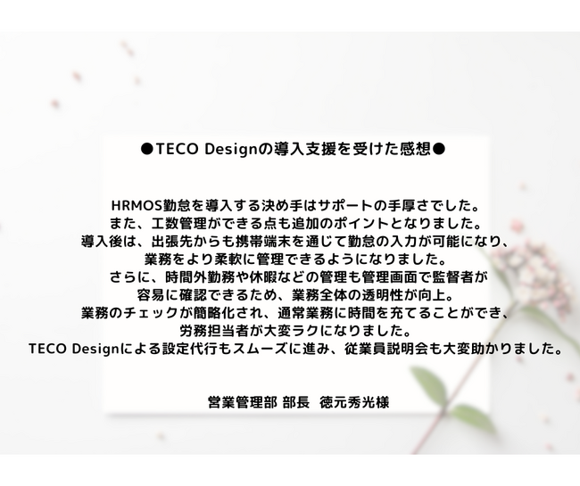 TECO Designは、今後も労務領域の効率化を、労務とシステムの両方の面からご支援してまいります。