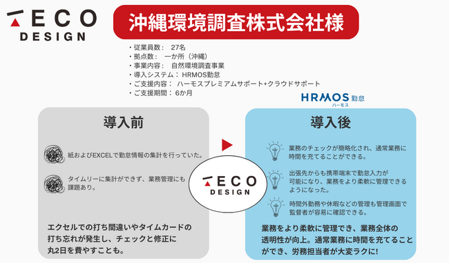 株式会社TECO Design(本社:福岡県福岡市、代表取締役社長 : 杉野愼)は、沖縄環境調査株式会社(所在地:沖縄県那覇市、代表取締役:中村 栄秀、以下 同社)の勤怠管理システム導入プロジェクトを支援しました。