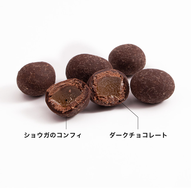 大きめにカットしたショウガのコンフィを、ダークチョコレートでコーティングしました。口に入れた瞬間、ショウガのフレッシュな香りが広がり、ほろ苦いカカオがショウガの風味を引き立てます。ショウガ好きの方におすすめしたい一品です。