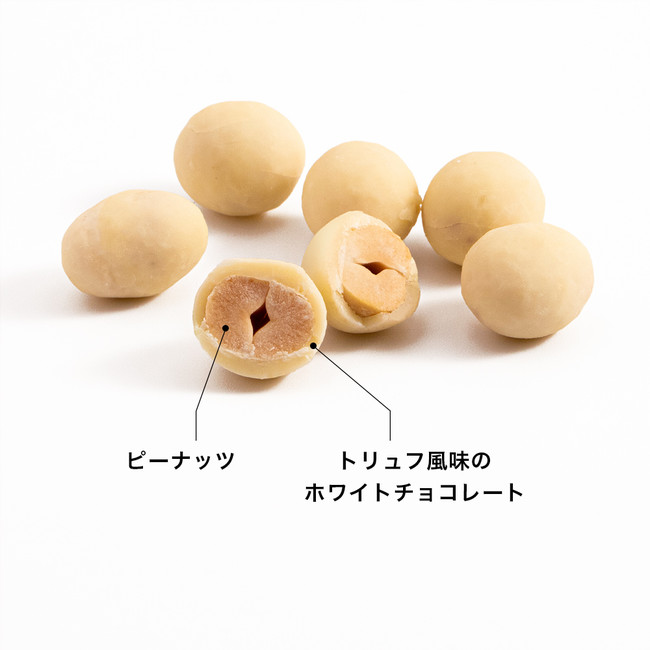 ローストしたピーナッツを、トリュフで風味付けしたホワイトチョコレートでコーティングしました。トリュフの豊かな香りと、程よい塩味で、大人のおやつにもぴったり。他にはない斬新なチョコレートです。