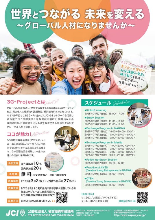 公益社団法人名古屋青年会議所は、名古屋市内の学生を対象に、今年度も継続事業として『3G-Project』(国際交流・海外渡航プロジェクト)を開催します。