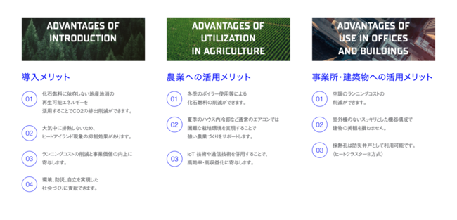 大型施設や農業現場に「快適さ」という付加価値を提供するため、自社の体験を伝え、世界に地中熱を普及していくための、エネルギー転換点に回答するウェブサイトです。
