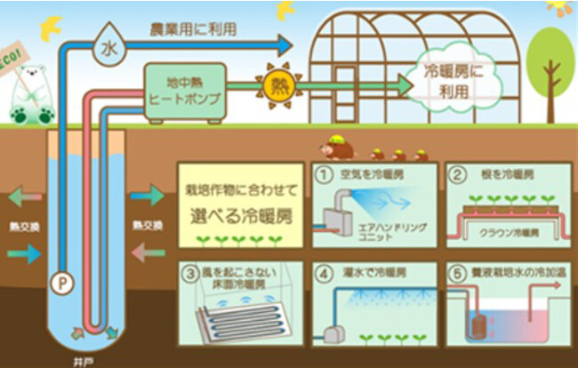 この技術を活用することで熱源となるボーリング孔の本数を通常の1/5にできるため、導入コストの削減につながるだけでなく、井戸水の活用も可能となる。
