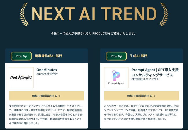 今回の「AIsmiley PRODUCT AWARD 2023 AUTUMN」は2023年6月1日から2023年8月31日までの3ヶ月間を審査対象としており、「One Minutes」はNEXT AI TRENDで選出されました。