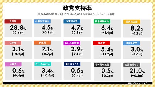 ジャッグジャパン株式会社(本社:東京都渋谷区)は、株式会社グリーン・シップ(本社:東京都千代田区)と業務提携し、グリーン・シップが提供する日次世論調査「世論レーダー」のデータを提供しております。本日、2026年3月第3週(3月9日~3月15日分)の内閣支持率・政党支持率調査の結果を発表いたします。