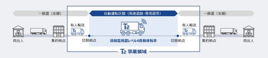 T2の事業概要:高速道路などの自動運転区間は無人運転で、集約拠点・切替拠点間は有人運転での輸送を想定