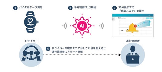 - 予兆制御AIが「30分先まで」の眠気リスクを予測し、運行管理者にスコアで提示
