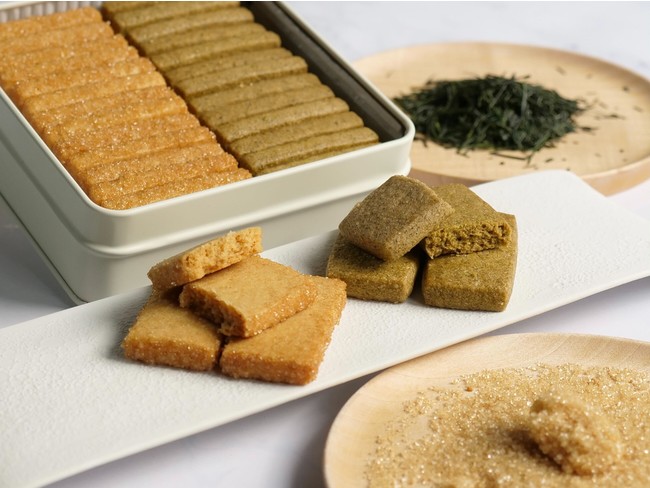パティシエ上妻の出身地・種子島の食材であるきび糖と緑茶を使用したオリジナルクッキー缶。