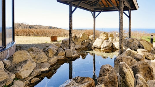 ▲ かんらん岩を使用した露天風呂からは水平線が望める