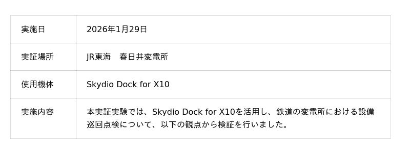 株式会社スカイピーク(本社:東京都渋谷区、代表取締役:高野 耀、以下 スカイピーク)は、東海旅客鉄道株式会社(本社:愛知県名古屋市、社長:丹羽 俊介、以下 JR東海)と、KDDIスマートドローン株式会社(本社:東京都千代田区、代表取締役社長:博野 雅文、以下 KDDIスマートドローン)と共に、2026年1月29日、ドローンポート「Skydio Dock for X10」を活用した、変電所自動巡視点検の実証実験を実施しました。