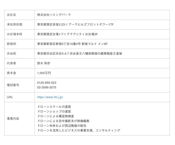 株式会社ハミングバード(ドローンスクールお台場・新宿・渋谷)について