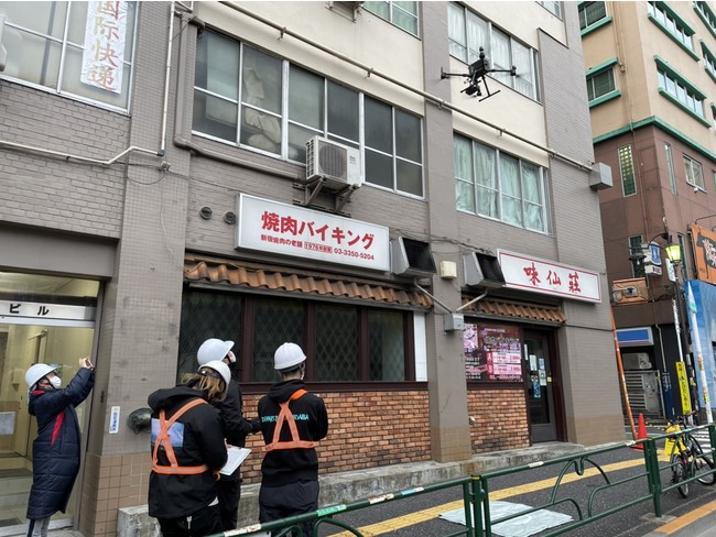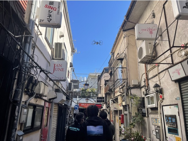 なかでも新宿三丁目の「新宿三光商店街振興組合」とは交流が深く、3月にはゴールデン街をPRするための空撮映像の撮影を行いました。また、新宿区内にあるマンションの外壁状況を調査するための点検を行ったりと、ドローンを活用した地元のPRや安全対策において協力関係を築いてまいりました。