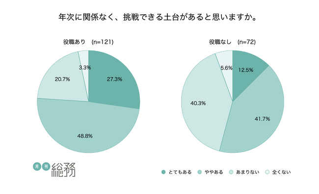 年次に関係なく挑戦できる土台がある総務組織は約7割。役職の有無で21.9ポイント差