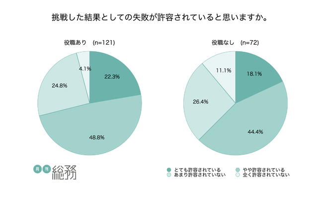 所属している総務組織は、挑戦した結果としての失敗が許容されていると思うか尋ねたところ、「とても許容されている」と「やや許容されている」が合わせて68.0%という結果になり、役職のある方は71.1%、役職のない方は62.5%と、役職の有無で8.6ポイント差となりました(n=197)。