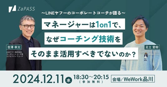 今回のリリースに合わせて、LINEヤフー株式会社 コーポレートコーチ室 エグゼクティブコーチで『1on1ミーティング「対話の質」が組織の強さを決める』の共著者でもある吉澤 幸太様をゲストにお招きし、無料セミナー「~LINEヤフーのコーポレートコーチが語る~ マネージャーは1on1で、なぜコーチング技術をそのまま活用すべきでないのか?」を12月11日(水)にWeWork 品川にて開催いたします。
