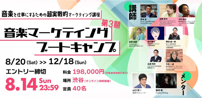 『音楽マーケティングラボ』に入会するためには、『音楽マーケティングブートキャンプ』講座を受講し、基礎となる智識を身に着けていただく必要があります。