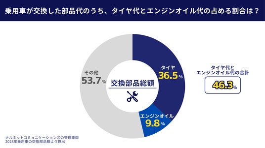 下記のデータは、ナルネットコミュニケーションズが2023年度に自動車整備工場へ依頼した交換作業の部品額の割合です。部品総額のうち、タイヤ代とエンジンオイル代が全体の46.3%を占めます。